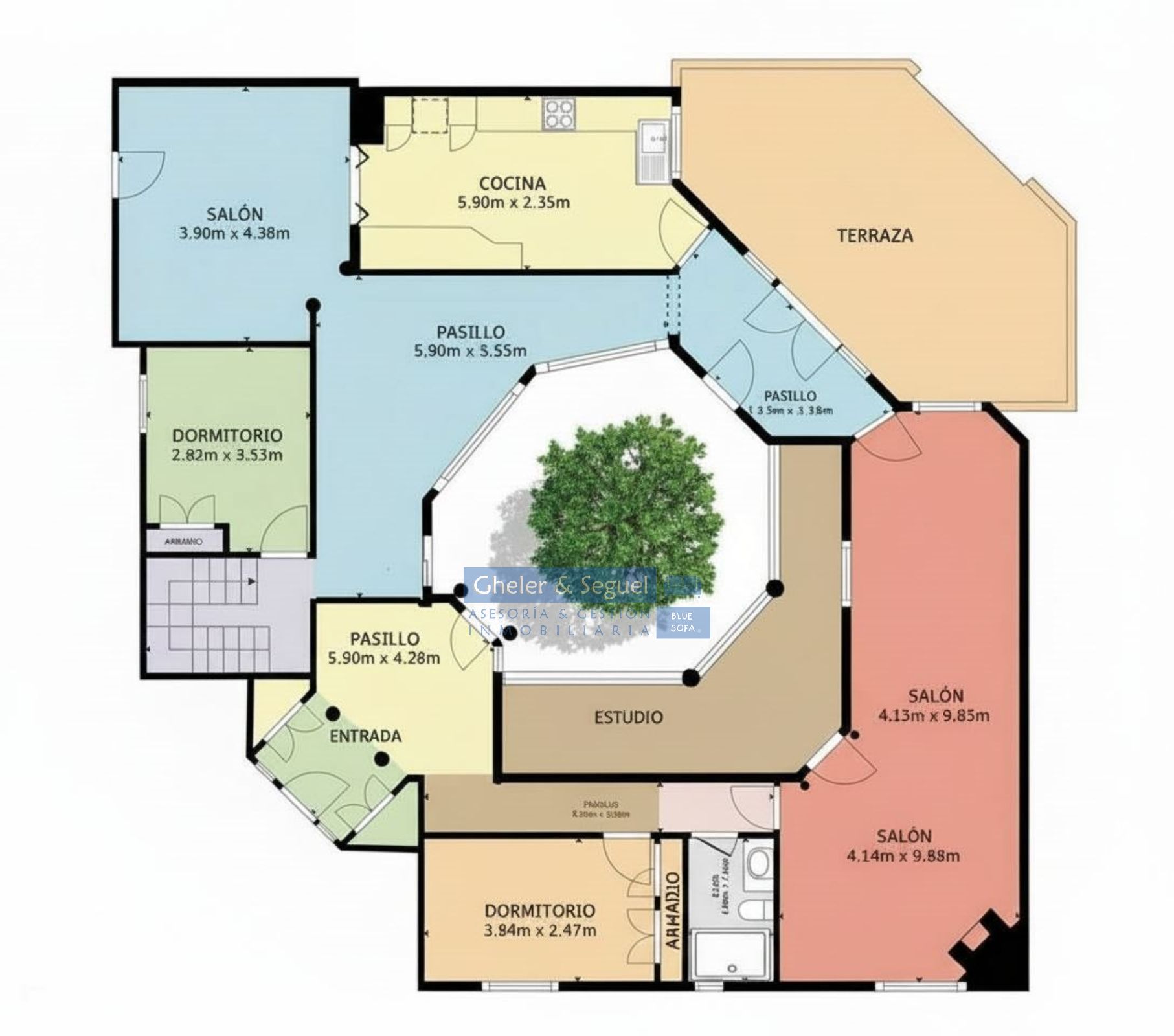 🏛️ Caractéristiques architecturales : La maison est située entre le grand jardin privé qui la sépare de la rue et l'immense jardin commun avec piscine. La maison est développée autour d'une petite cour privée. On pourrait penser que le design de l'ensemble a été inspiré par le cloître du Monastère Royal de Santa María, situé à proximité.