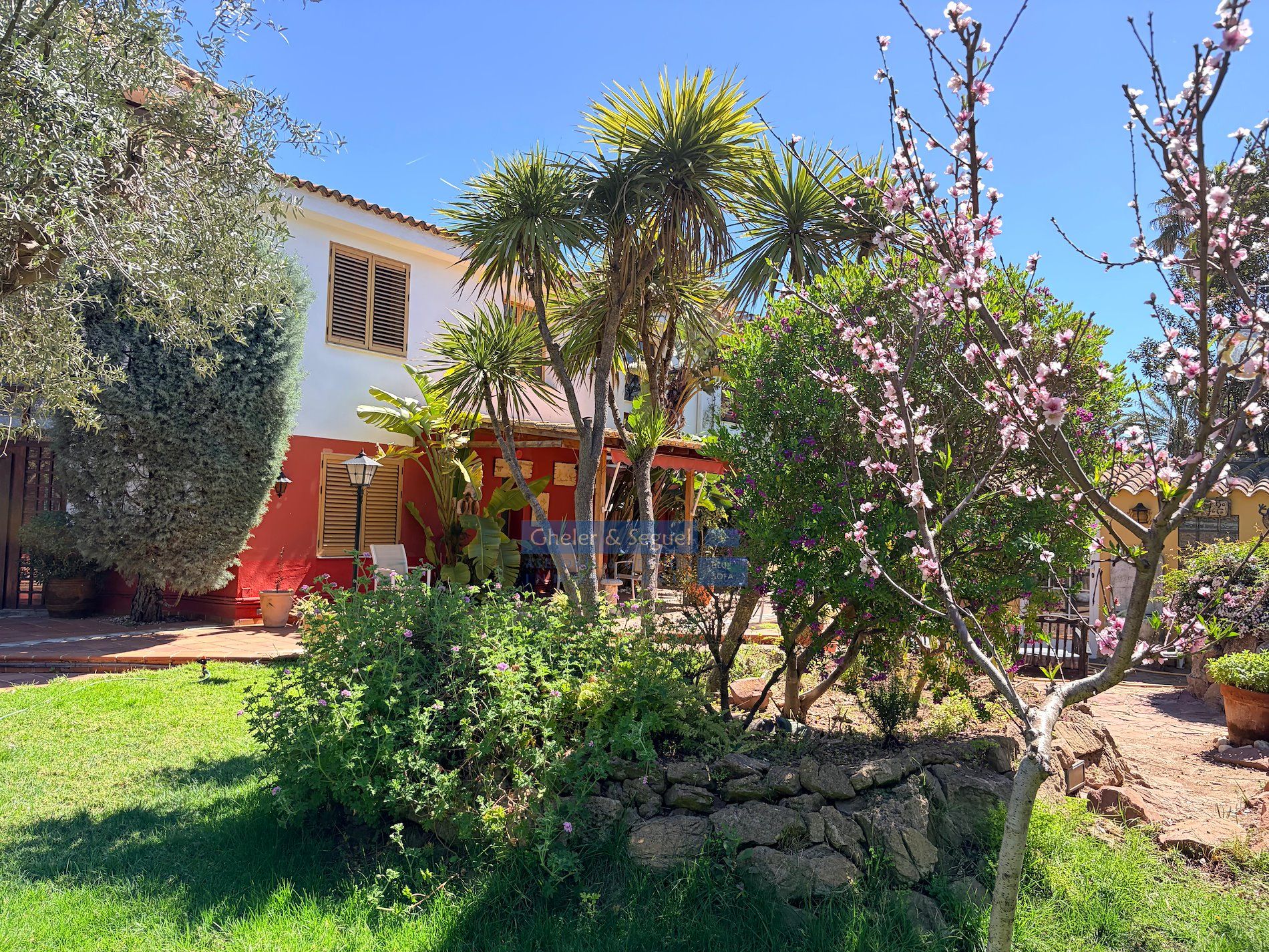 Su jardín —más amplio, protegido por árboles maduros— prolonga la arquitectura hacia el cielo.