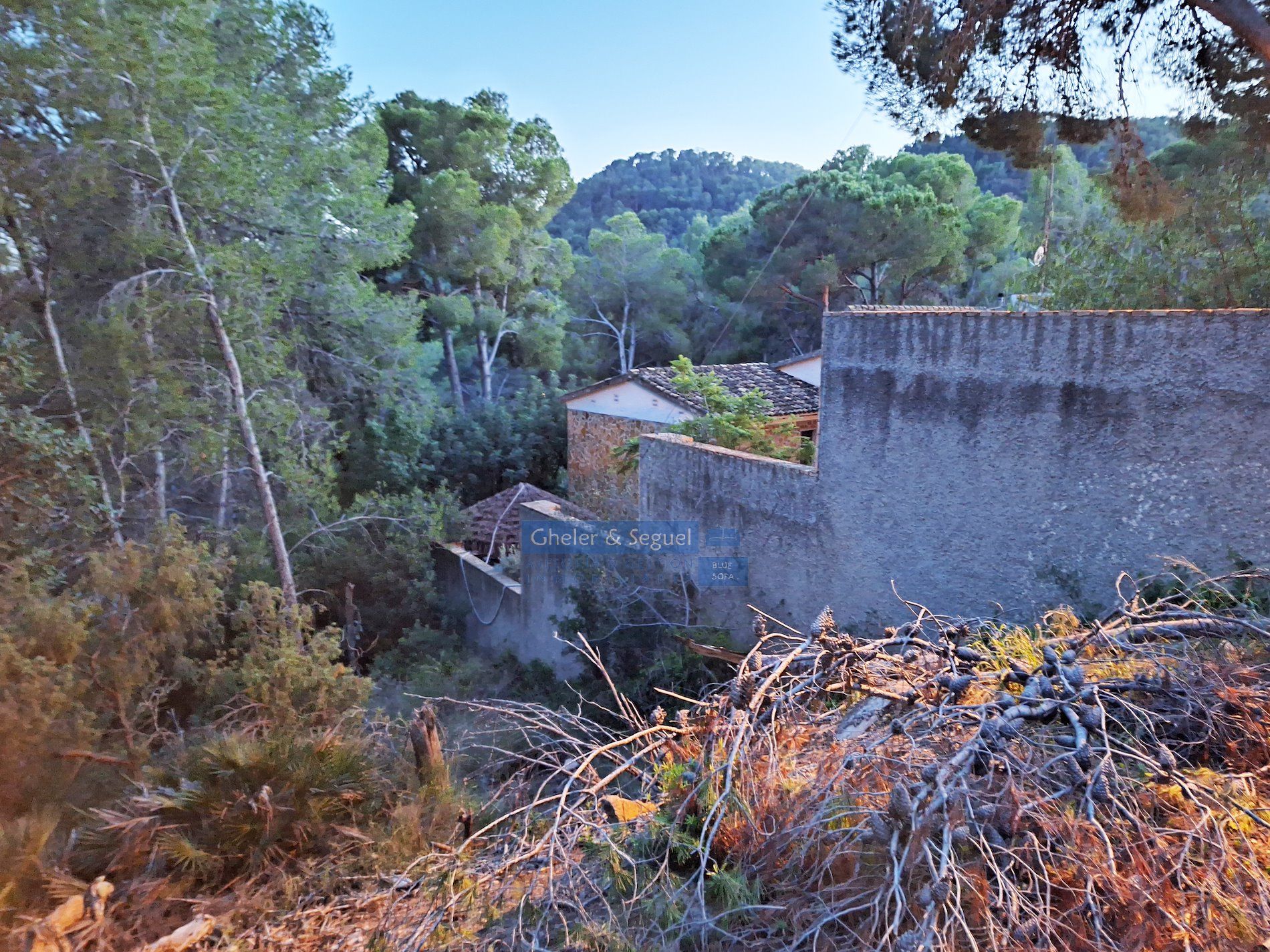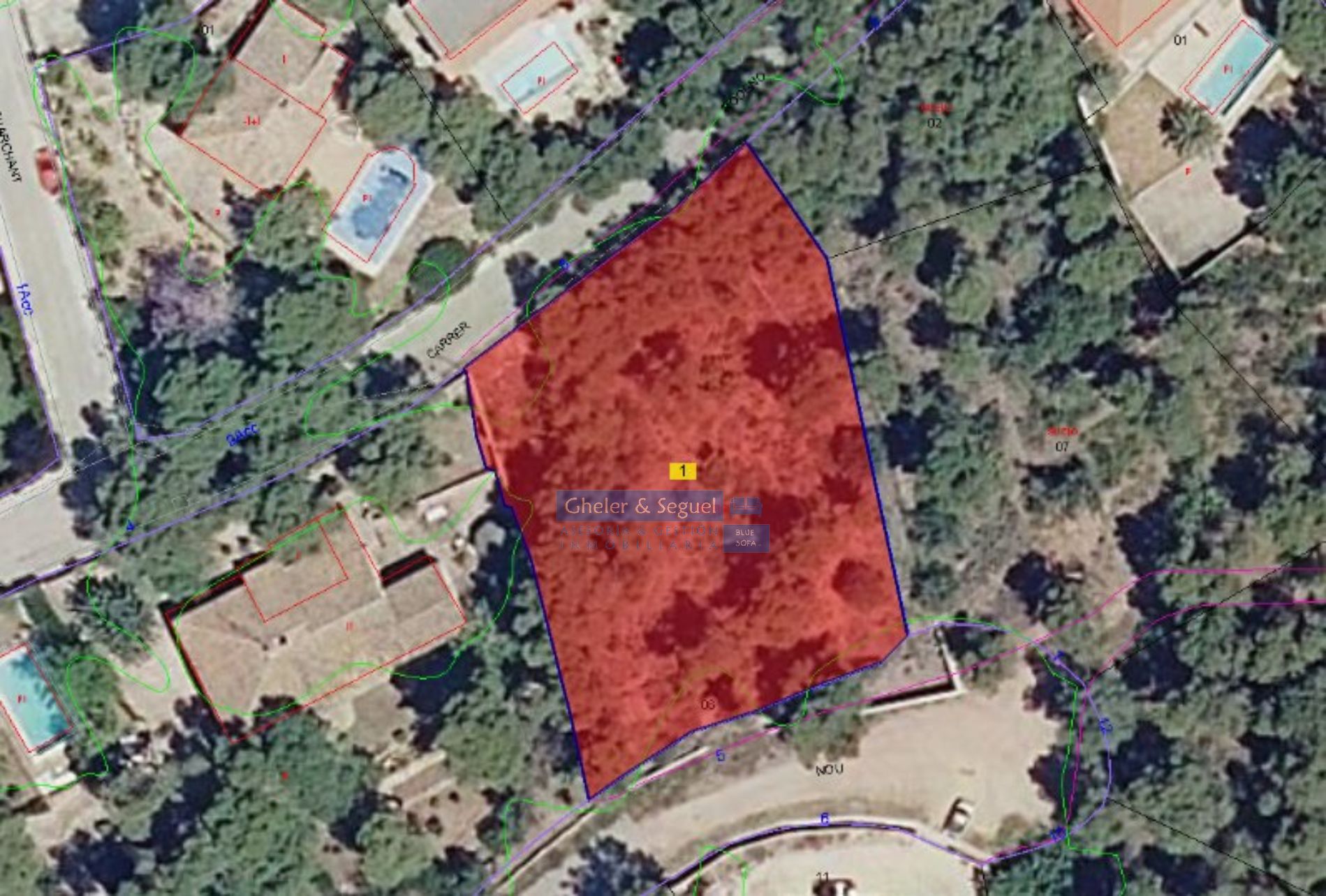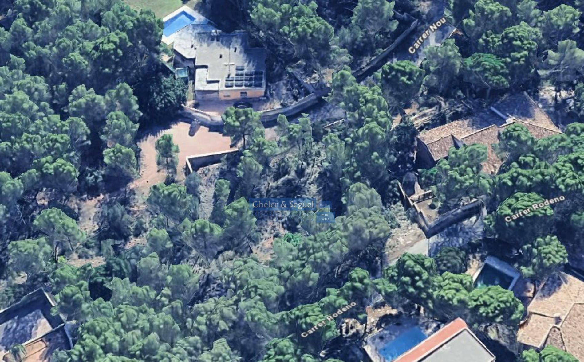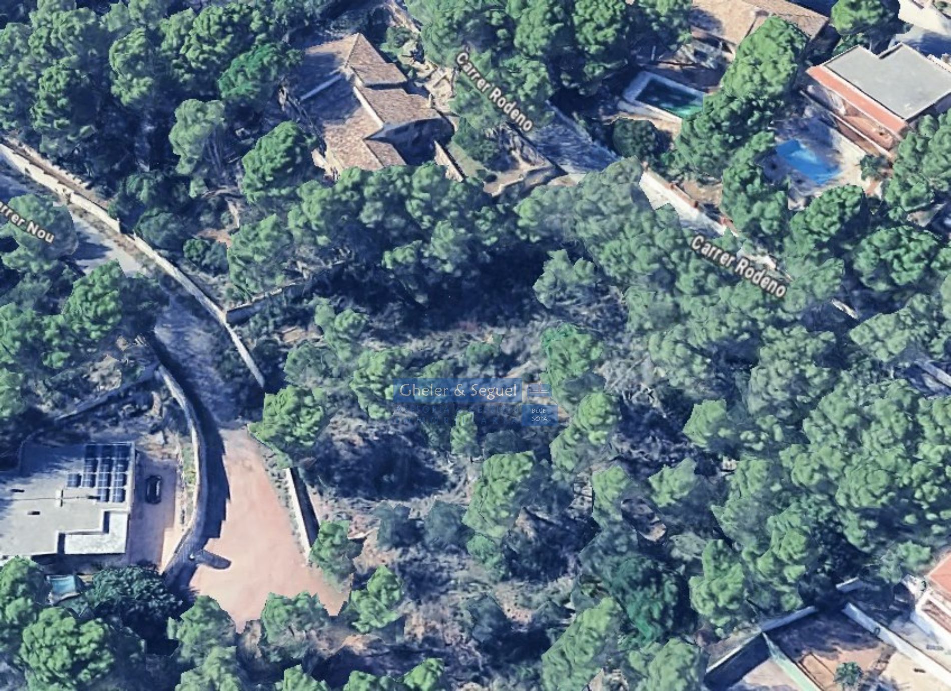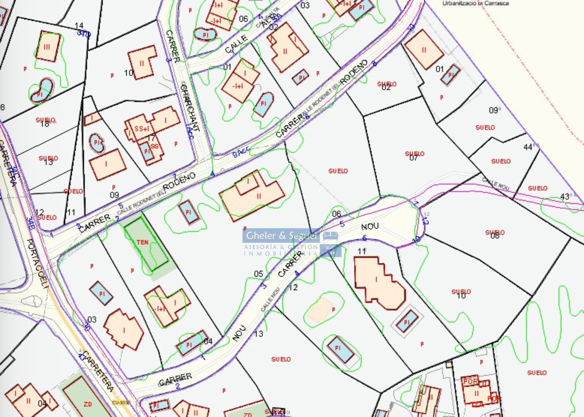 La parcela de 1.696m² tiene acceso a dos calles. Con 35m de frente a calle Rodeno y 35m de frente a calle Nou y un fondo de unos 45m, siendo la diferencia de altura entre una calle y otra de unos 11m.